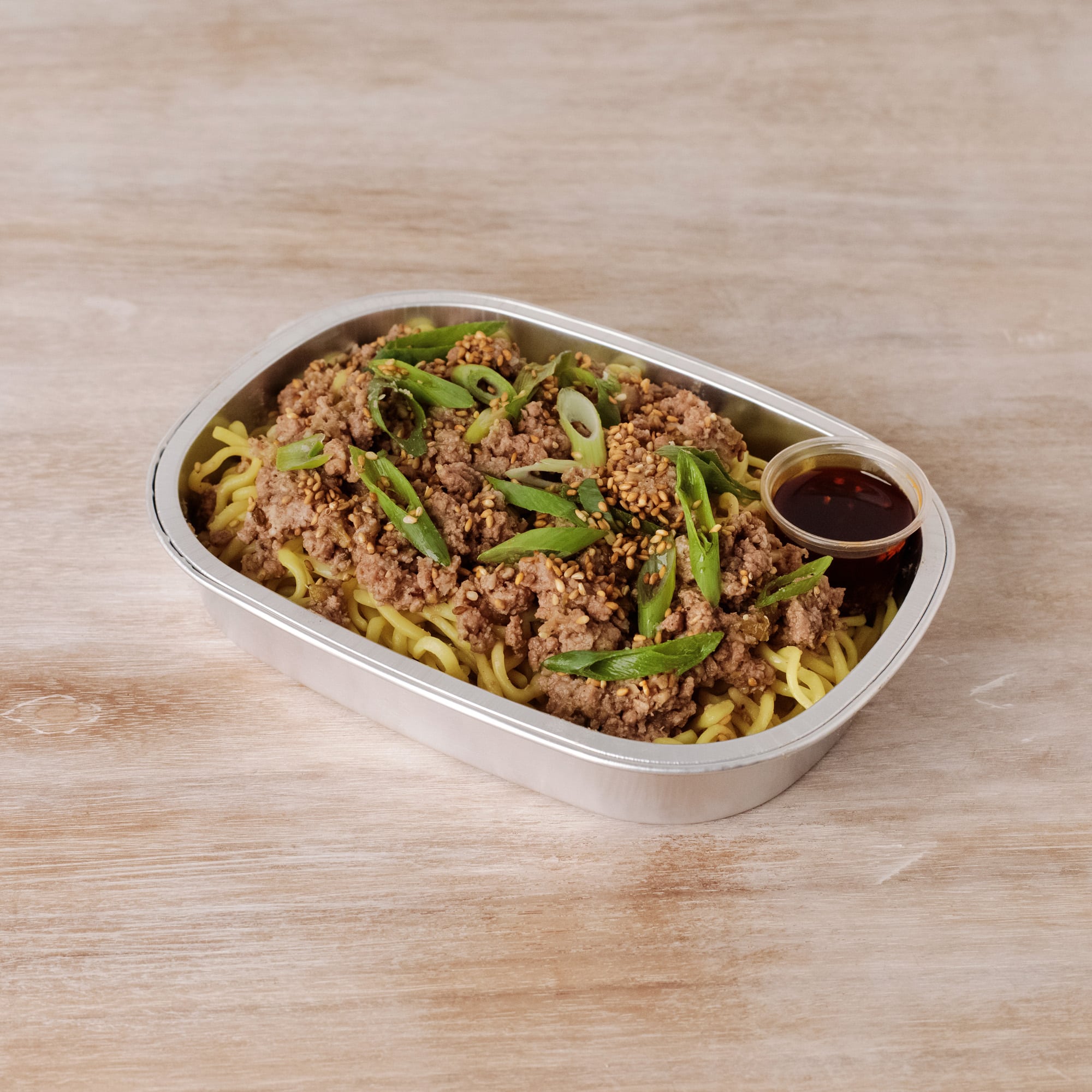 Our twist on Dan Dan noodles. Al dente Ramen noodles topped with ginger, star anise-scented ground pork, and topped with mildly spicy, but very aromatic chili crunch.